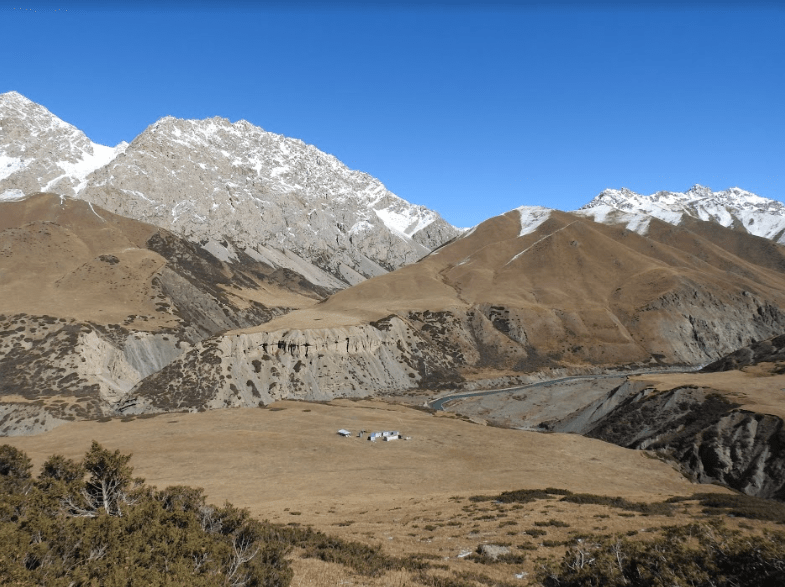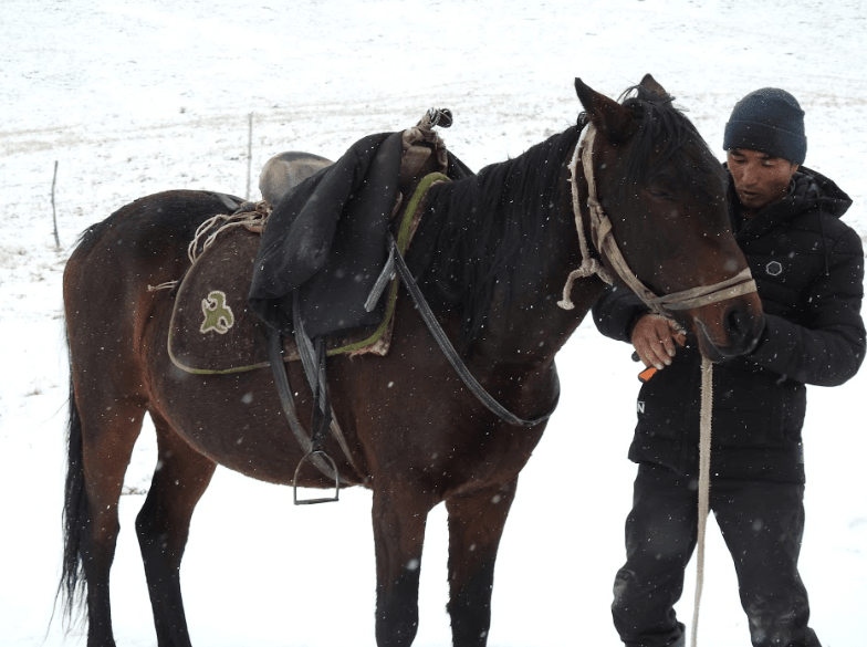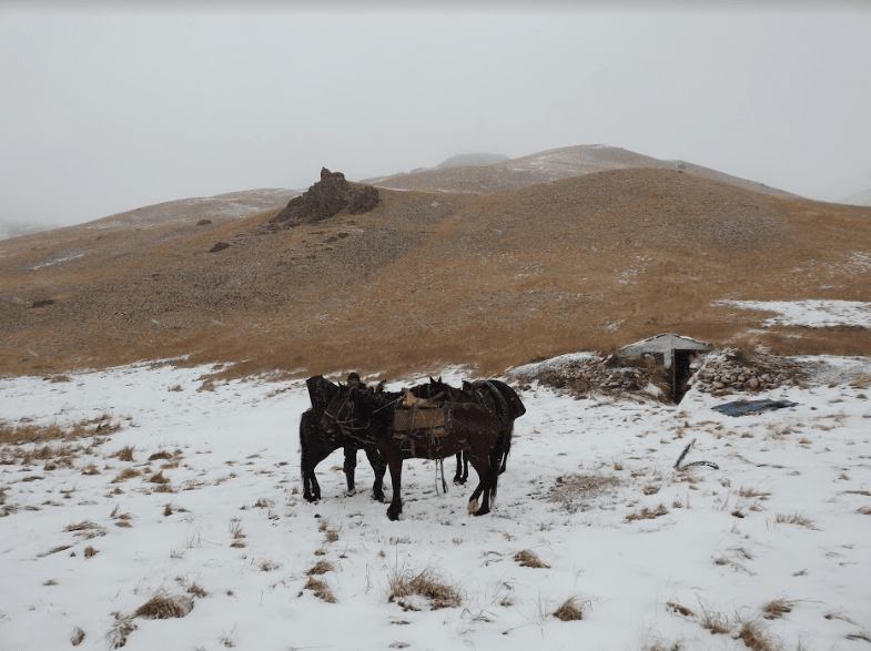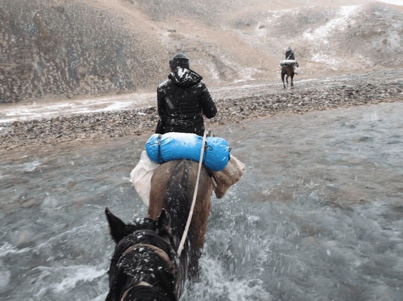 Mellem bjerge med sneklædte tinder lå vores basecamp. Denne lejr var første stop, inden vi skulle fortsætte på hesteryg til jagtområderne i bjergene den næste dags morgen.