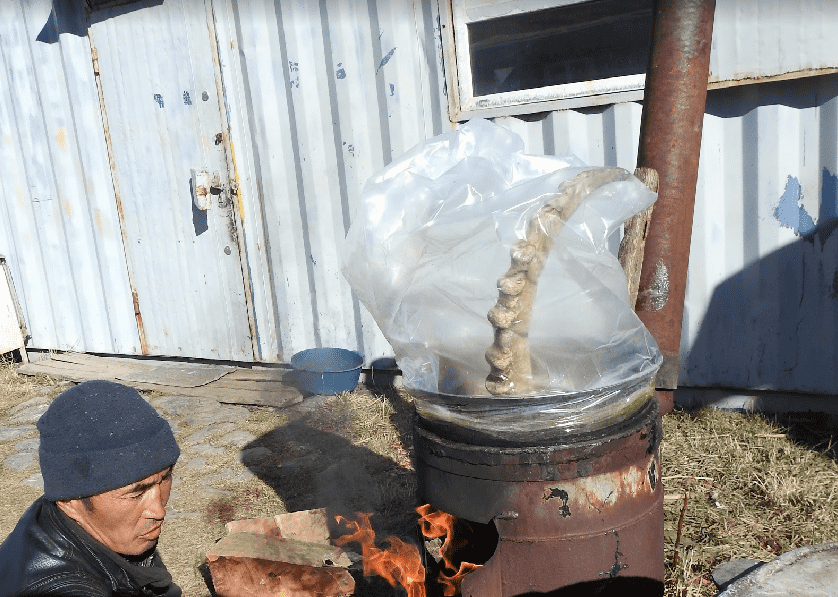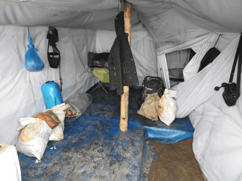 Efter yderligere tre timers ridt nåede mine guider og jeg den jordhytte, hvor vi skulle tilbringe de næste døgn. Det var ganske primitive forhold. Hytten var gravet halvt ind i terrænet og dækket med sten og jord.