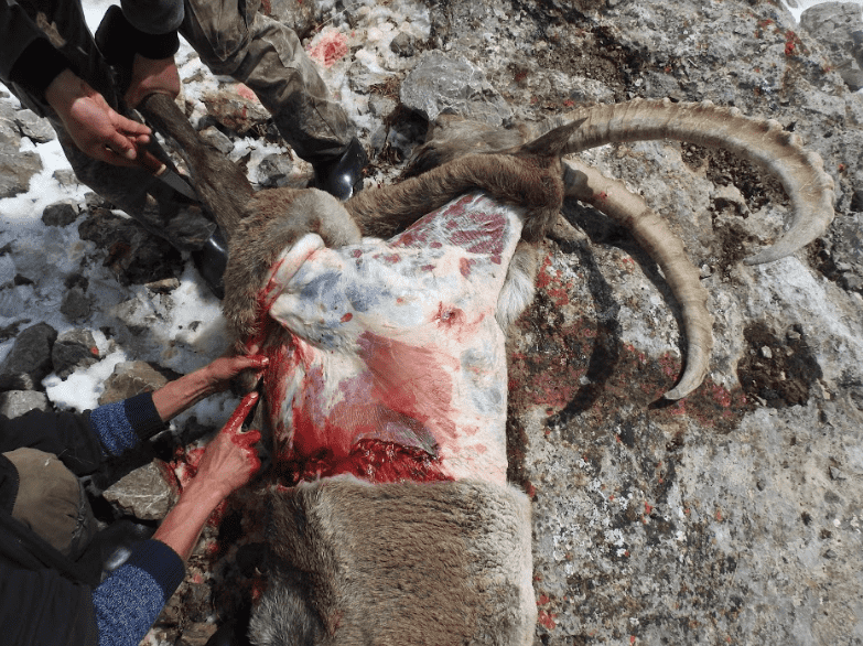 Næste dags morgen red vi op til bukken, som allerede var blevet spottet af et par sultne ravne. Da jeg gerne ville have ibex’en hovedmonteret, startede de dygtige guider arbejdet med knivene, så skindet på forkroppen kom med.