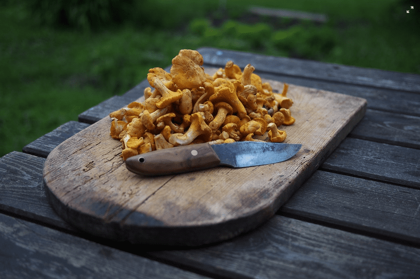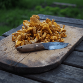 Kantarellerne skyldes forsigtigt, og de 3-4 flotteste gemmes til stegning. resten hakkes groft og gemmes.