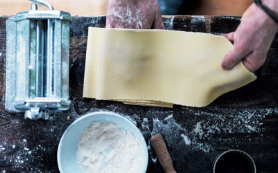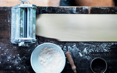 - Rul pastaen igennem pastamaskinen på den tykkeste indstilling. Fold den på midten, og rul dejen igennem pastamaskinen igen. Gentag processen 10 gange, til dejen får en "glat" struktur.