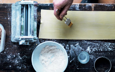 - Drys køkkenbordet med semolinamel, og bred pastapladen ud over bordet. Del pastaen i to stykker, så det er lettere at arbejde med. Pensl pastaen med lidt vand.