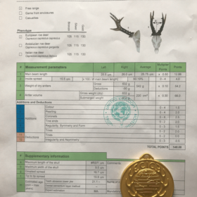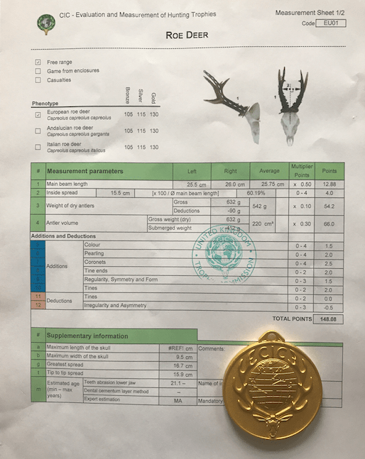 Alf opmålte bukken til 151,10 points. Jeg valgte at efterlade bukken i Skotland, og bukken blev af CIC, UK Trophy Commission opmålt til 148,08 points, og blev således registreret i deres jagtbøger.