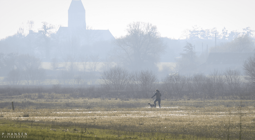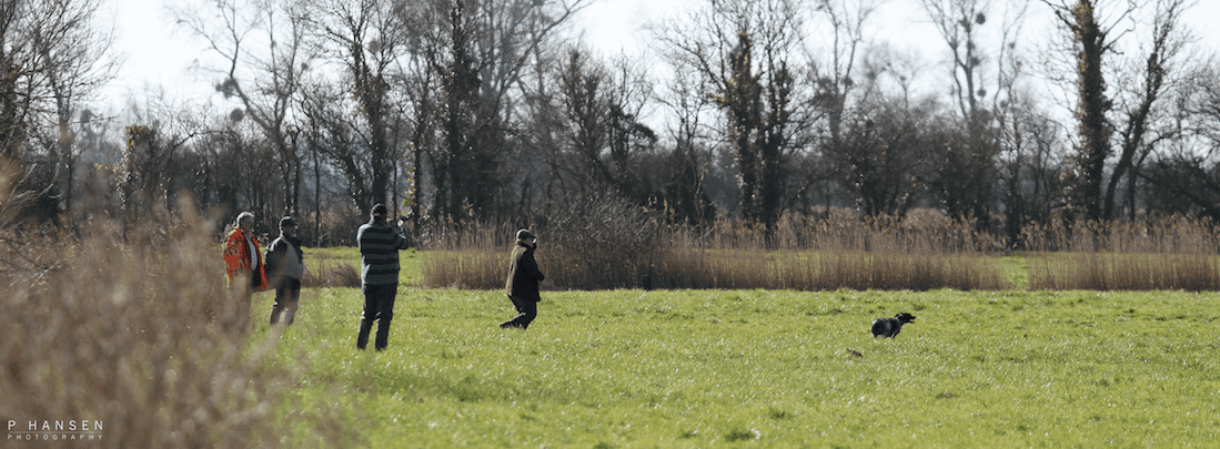 Det var lunt, ca. 12 grader, og terrænet bestod af mindre engparceller. Der er ofte en del dybe grøfter og kanaler, hvilket kræver, at man har skridtstøvler på. Alternativt kan man klare turen i almindelige gummistøvler, men så risikerer man at skulle gå lange omveje for at nå frem til sin hund, hvis den har stand. Unge Odile lagde ud. Hun havde et fint slip, men der var desværre ingen fugle.