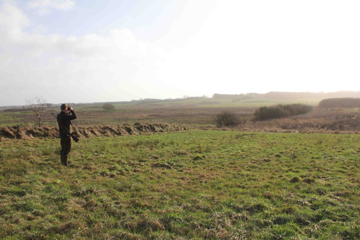 Under vinterjagten er det vigtigt at bruge sin kikkert, således at man udser sig de korrekte dyr inden jagten med henblik på udvælgelse til afskydning. Det var også tilfældet på denne blæsende jagtdag. På forhånd blev det aftalt at gå efter gamle råer og mindre lam og smaldyr. Allerede på vejen ud til terrænet blev de første spring opdaget i kikkerten.